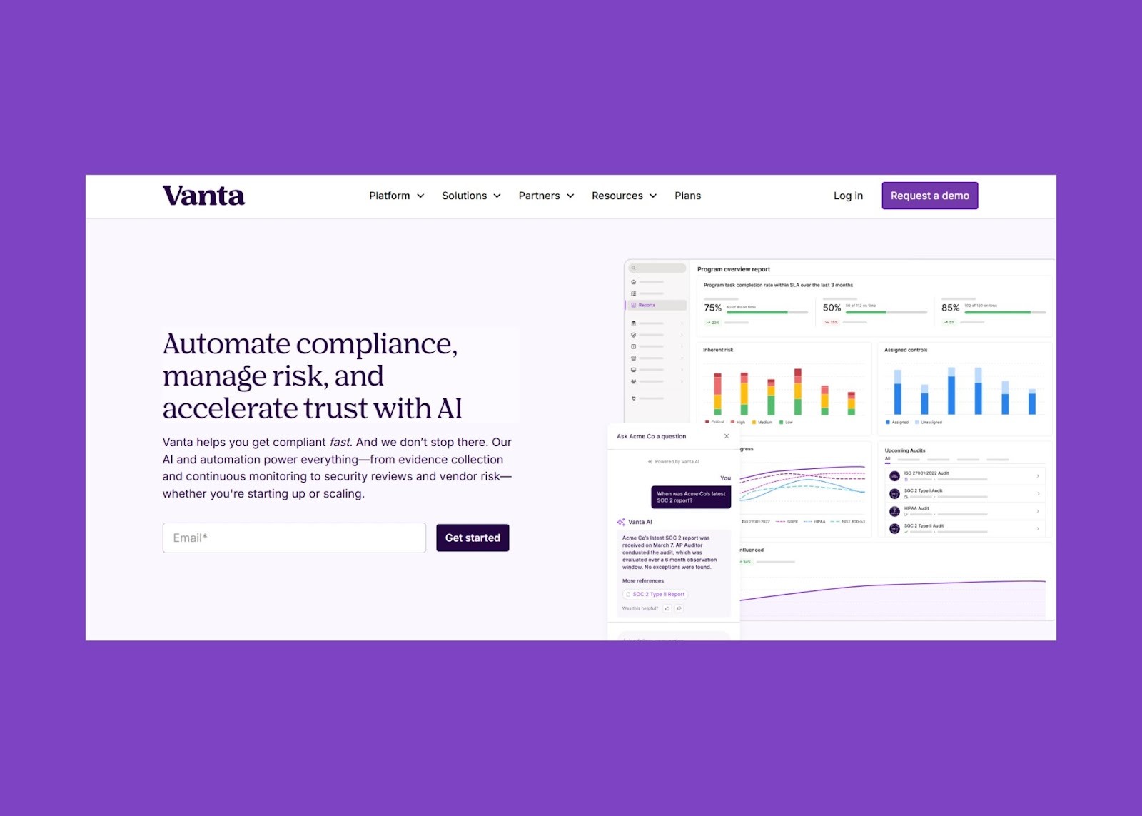 Vanta offers comprehensive third-party risk management that can reduce assessment times from 50 hours to just a few hours per vendor. Their platform includes advanced AI options for vendor security evals with automated evidence requests and AI-powered document analysis.