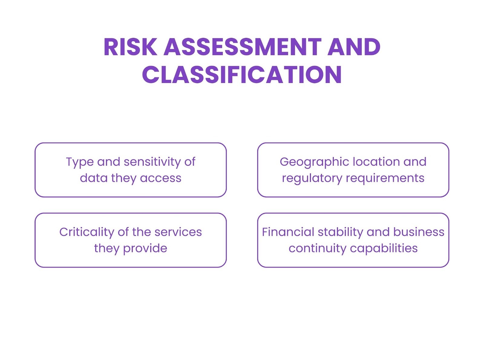 Organizations must conduct risk assessments for all third parties accessing data or systems. Vendors should be classified based on: